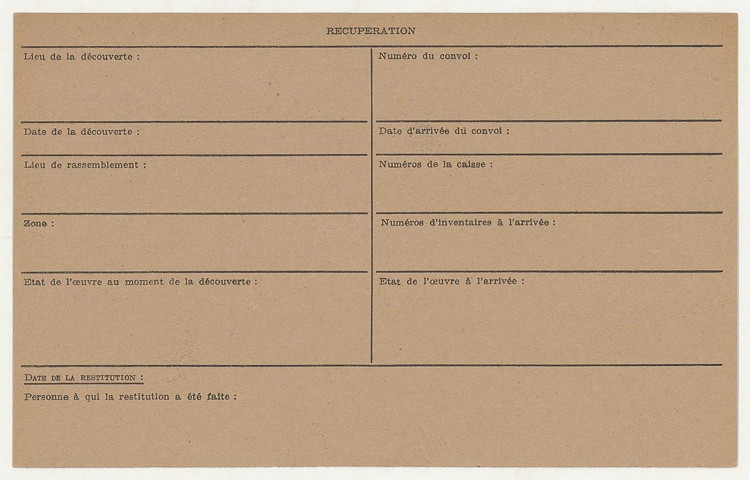 Cette série contient les fichiers - fichiers d'oeuvres spoliées, fichiers d'oeuvres rassemblées dans les collectings points puis rapatriées, fichiers de propriétaires spoliés, fichiers d'achats faits par les Allemands, autres fichiers - établis par les services de récupération artistique (Commission de récupération artistique, Bureau central des restitutions, Bureau d'investigation artistique, Collecting Points). Classement par types d'objets, noms d'artistes, noms de collectionneurs, noms de marchands.