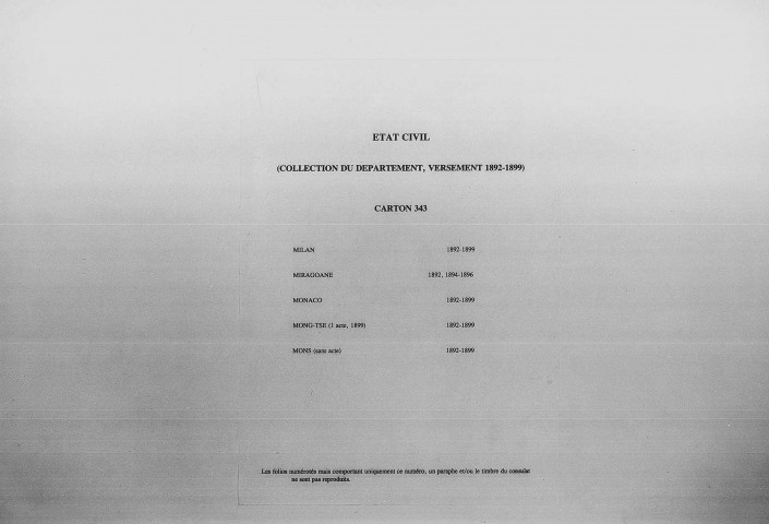Il est également à noter que le versement des registres d'état civil de 1900 n'avait été effectué que pour les postes d'Aden à Rome. Les registres des postes de Rosario à Zurich avaient été classés dans la série 486QO. Ces derniers en ont été extraits en 2024 pour être réintégrés dans la sous-série 1900 de la série 172QO où ils constituent les cartons 372 à 374.