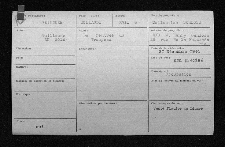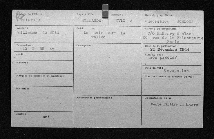 Les fichiers d'œuvres spoliées (série « Fichiers », cotée 209SUP/738-887) ont été établis d'après les déclarations de victimes ou d'après la listes des biens retrouvés en Allemagne et en Autriche.