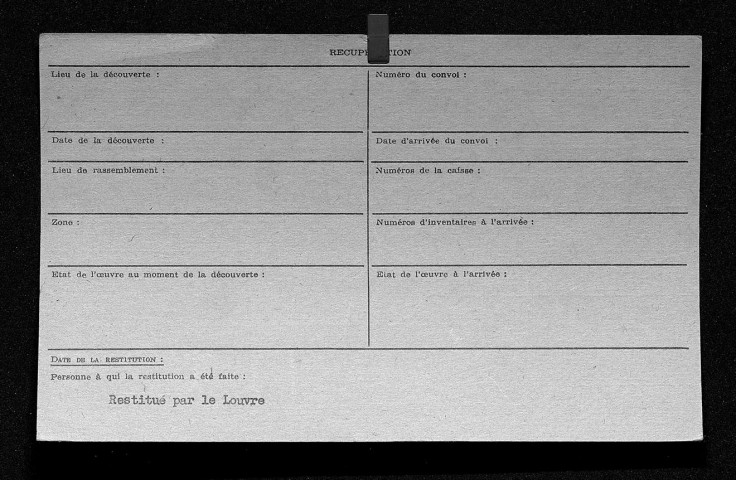 Cette série contient les fichiers - fichiers d'oeuvres spoliées, fichiers d'oeuvres rassemblées dans les collectings points puis rapatriées, fichiers de propriétaires spoliés, fichiers d'achats faits par les Allemands, autres fichiers - établis par les services de récupération artistique (Commission de récupération artistique, Bureau central des restitutions, Bureau d'investigation artistique, Collecting Points). Classement par types d'objets, noms d'artistes, noms de collectionneurs, noms de marchands.