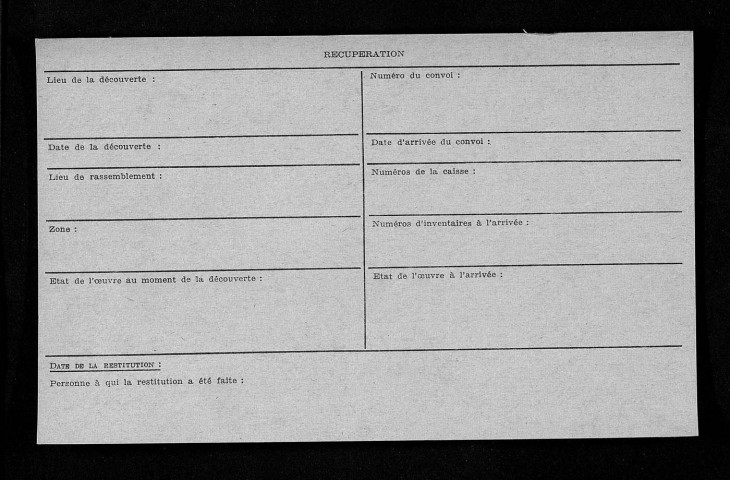 Cette série contient les fichiers - fichiers d'oeuvres spoliées, fichiers d'oeuvres rassemblées dans les collectings points puis rapatriées, fichiers de propriétaires spoliés, fichiers d'achats faits par les Allemands, autres fichiers - établis par les services de récupération artistique (Commission de récupération artistique, Bureau central des restitutions, Bureau d'investigation artistique, Collecting Points). Classement par types d'objets, noms d'artistes, noms de collectionneurs, noms de marchands.