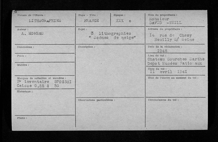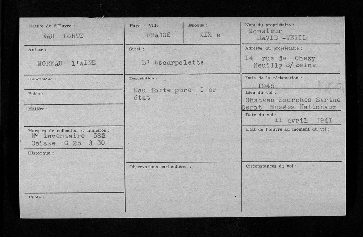 Les fichiers d'œuvres spoliées (série « Fichiers », cotée 209SUP/738-887) ont été établis d'après les déclarations de victimes ou d'après la listes des biens retrouvés en Allemagne et en Autriche.