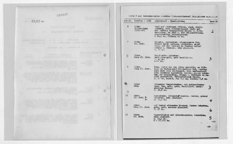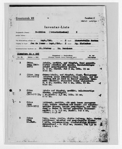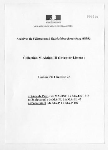 Copies des listes d'œuvres dressées par le service allemand ERR au moment des spoliations. S'y ajoutent des archives retrouvées par les Alliés documentant l'activité de l'ERR.