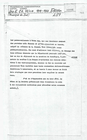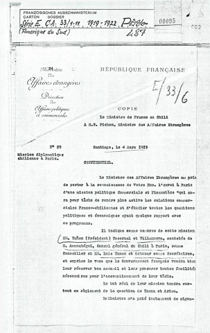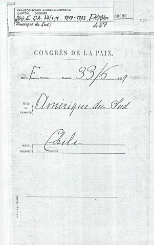 Correspondance de la représentation diplomatique française avec le Secrétariat de la Conférence. Possibilité de cession des mines de salpêtrières Allemandes sur le territoire aux Alliés (mai 1919), accord signé entre l'Angleterre et le Chili, pour l'intervention d'une commission internationale en cas de litige non résolut par voie diplomatique (mars 1919), mission diplomatique chilienne à Paris, pour améliorer les relations commerciales avec la France, relevés et évaluations des biens des vaincus, sur les territoire de Tarapaca, Tacna et Arica (avril 1919), adhésion du Chili à la Ligue des Nations et reconnaissance du nouveau gouvernement allemand (août 1919), interdiction de commercer avec les navires allemands (décembre 1919), interdiction de l'utilisation des biens allemands à l'étranger par les Allemands (mai 1919-janvier 1920).