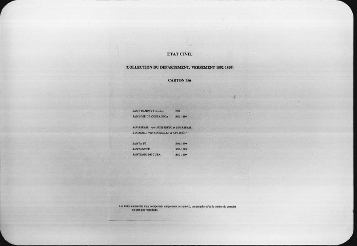 Il est également à noter que le versement des registres d'état civil de 1900 n'avait été effectué que pour les postes d'Aden à Rome. Les registres des postes de Rosario à Zurich avaient été classés dans la série 486QO. Ces derniers en ont été extraits en 2024 pour être réintégrés dans la sous-série 1900 de la série 172QO où ils constituent les cartons 372 à 374.