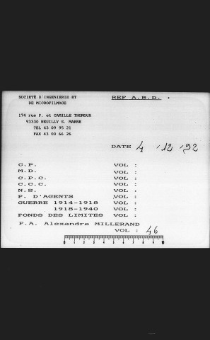 Le fond Millerand comprenait au départ 41 cartons; le travail de classement a surtout consisté en l'articulation des différentes séries qui ont été divisées en 101 volumes : les plus intéressants ont été reliés. Un inventaire numérique du nouveau classement a été établi; pour faciliter les recherches, on a dressé une table de concordance de l'ancien et du nouveau classement.