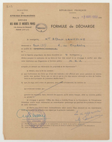 Cette sous-série se compose de dossiers nominatifs de réclamation adressés par les victimes (institutions ou particuliers) à l'Office des biens et intérêts privés, en vertu de l'arrêté du 16 avril 1945. Ces dossiers sont classés par noms de requérants. Il s'agit parfois de simples copies des dossiers adressés à la CRA. La consultation de cette série doit être complétée par la série 13BIP (Spoliations allemandes en France) où l'on peut trouver des documents supplémentaires et la série 22BIP (Restitutions)