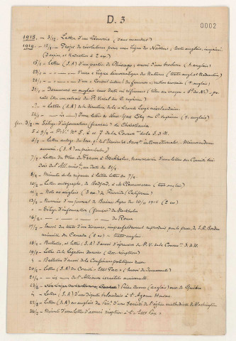 La structure du classement se base en grande partie sur le plan de classement originel. L'organisation interne de la plupart des articles originaux a été respectée même si des rapprochements ont pu être opérés pour des raisons de cohérence intellectuelle. Les anciennes cotes alphanumériques (D.1, D.2, D.3) figurant sur les documents ont, lorsque cela était possible, été mentionnées entre parenthèses dans la description de l'article. Le plan de classement répond à une double logique chronologique et organisationnelle. La typologie des documents étant très peu diversifiée (correspondance, télégrammes, bordereaux d'envois, etc.), elle n'est mentionnée que quand elle est unique ou qu'elle fait exception, par exemple des procès-verbaux ou sténographies de séances. L'analyse comporte également le nombre de folios de l'article.
