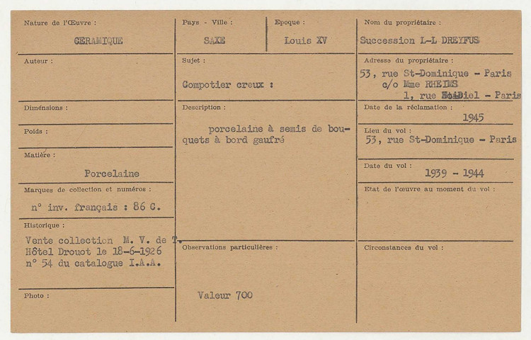 Les fichiers d'œuvres spoliées (série « Fichiers », cotée 209SUP/738-887) ont été établis d'après les déclarations de victimes ou d'après la listes des biens retrouvés en Allemagne et en Autriche.