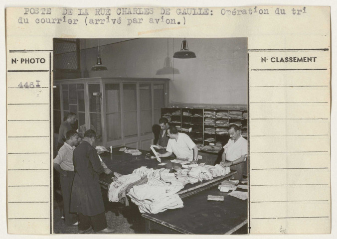 "Poste de la rue Charles de Gaulle : arrivée du courrier international par avion, opération du tri".Cliché n°4461