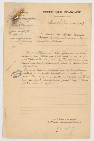 Correspondance avec la sous-direction des Affaires de chancellerie (janvier-décembre 1907).