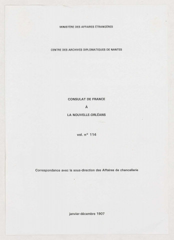 Répertoire numérique détaillé des archives rapatriées du consulat de France à La Nouvelle-Orléans, série A, an XIII-1918, Elisabeth de Grimoüard-Caude, conservateur du patrimoine, 1999-2000, 191 p, dactyl.