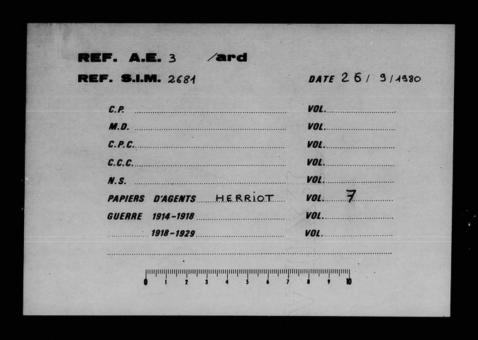 Certains dossiers reliés, portant le timbre du musée historique de Lyon, ont été réclamés par le préfet du Rhône. Il s'agit d'informations sur la grande guerre, réunies du point de vue lyonnais : listes de tués, lettres de combattants à M. Herriot, notations de faits de sa main... Sans doute le président, ayant constitué ces dossiers à l'époque, estima-t-il, après coup, qu'ils offraient un intérêt pour l'histoire de Lyon et les remit-il au musée historique de cette ville, pour les lui réemprunter par la suite. Ils ont été renvoyés au préfet du Rhône.