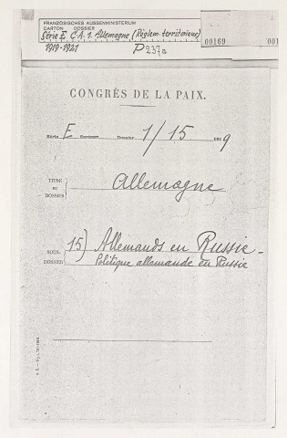 Situation des troupes allemandes sur le territoire, relations diplomatiques et économiques, entraide, plan réactionnaire, traité germano-russe, question bolchévique, réorganisation de la Russie et de l'Ukraine (janvier 1919-juin 1926).