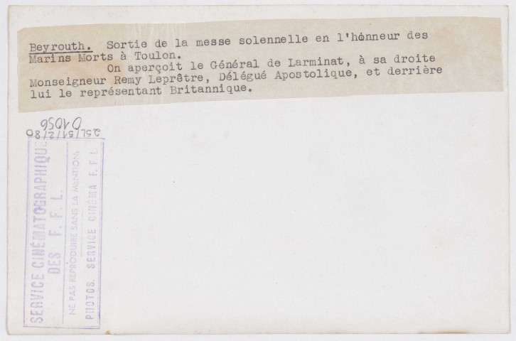 [5] Ce service, qui existe à l'état embryonnaire dès juillet 1940 à Londres, rend compte des activités politiques et militaires des Forces françaises libres. À ses débuts, les photographies sont prises par un personnel anglais, les ralliements français étant rares, et les prises de vue réalisées par la société de production cinématographique British Paramount. [La France et le Proche-Orient 1916-1946, Pierre Fournié et Jean-Louis Riccioli, Castelman, Italie, 1996.]