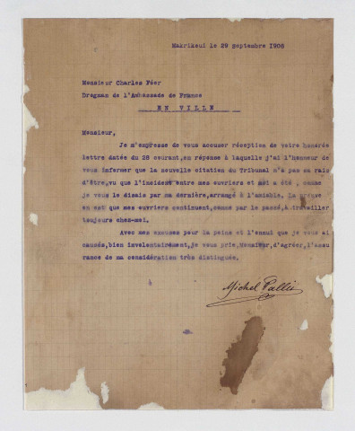 - Ff. 1-2 - Michel Pallit, au sujet d'un litige avec ses ouvriers (Makri-Keuï, 29 sept. 1908)