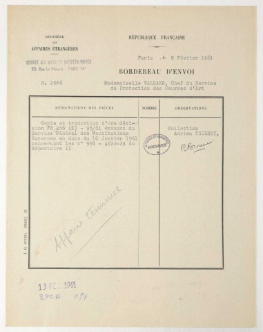 Les fichiers d'œuvres spoliées (série « Fichiers », cotée 209SUP/738-887) ont été établis d'après les déclarations de victimes ou d'après la listes des biens retrouvés en Allemagne et en Autriche.