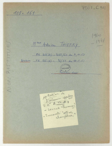 Les 2 443 dossiers nominatifs de réclamation adressés par les victimes à la CRA et à l'OBIP, en vertu des décrets des 13 et 24 novembre 1944 et de l'arrêté du 16 avril 1945, constituent l'origine du fonds (séries CRA et OBIP, cotées 209SUP/1 à 73, et 209SUP/591-705 et 726-737, 209SUP/921-927, 1061-1065, 1100-1145). Ces dossiers se composent de la correspondance entre les victimes et l'administration, des listes et descriptions des biens spoliés, accompagnées parfois de photographies (série « Albums photographiques », cotée 209SUP/933 à 1044), ainsi que des lettres de décharge en cas de restitution des biens.