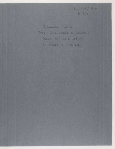 À ces dossiers de réclamation s'ajoutent les archives des services français localisés en zone d'occupation en Allemagne et en Autriche, chargés de retrouver et de rapatrier les biens spoliés (séries alphabétiques A à R, cotées 209SUP/108 à 590). Ces archives comprennent les claims, les correspondances entre services, les rapports d'enquêtes, les liaisons avec les zones d'occupation alliées et leurs collecting points, les listes de biens rapatriés en France.