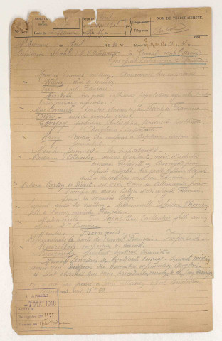 * Dont une note au crayon émanant du commandant en chef allemand du poste Z26, au Nord-Est de Sedan, en date du 3 novembre 1918 à 15h30, signalant « qu'un grand nombre d'habitants civils français se trouvent encore derrière les lignes allemandes ».