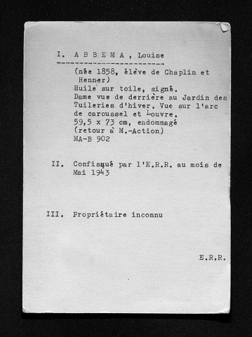 Les fichiers d'œuvres spoliées (série « Fichiers », cotée 209SUP/738-887) ont été établis d'après les déclarations de victimes ou d'après la listes des biens retrouvés en Allemagne et en Autriche.
