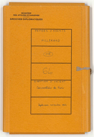 Le reste des papiers laissés par Millerand a été remis à la Bibliothèque Nationale qui les a ensuite cédés aux Archives nationales où ils sont conservés sous la cote 470 AP, voir fiche descriptive du fonds, pp. 725-727.