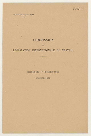 Le premier article couvre la Conférence internationale socialiste de Berne de février 1919 qui aurait dû se tenir à Paris, mais que les puissances alliées ont réussi à détourner vers la Suisse pour éviter toute altercation pendant la Conférence de paix. Toutefois, les membres de la Conférence ont tout de même perçu la nécessité de créer une commission qui étudierait la législation internationale du travail. L'article 2 est un dossier général qui rassemble une documentation diversifiée sur les sujets abordés par la Commission, mais aussi sur l'influence des acteurs extérieurs à la Commission. Les articles 3 à 6 font état des travaux de la Commission de législation internationale du travail à travers la documentation officielle (rapport, sténographies et procès-verbaux des séances). L'article 7 concerne l'organisation et le déroulement de la Conférence internationale du travail de Washington du 29 octobre au 29 novembre 1919, première rencontre officielle de l'OIT.