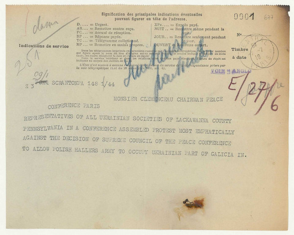 Mouvements pour la reconnaissance par la Conférence de la Paix d'une Ukraine indépendante ou pour le rattachement à une Russie non soviétique, revendication de la Russie des Carpates, de la Galicie Orientale et de la Bucovine occupées par la Pologne, persécutions et droits des minorités nationales, revendication de la Bessarabie occupée par la Roumanie, front contre l'armée russe du Sud-Ouest et persécutions sur le territoire ukrainien, lutte contre l'armée rouge, demande d'aide aux Alliés, relations franco-ukrainiennes, prisonniers de guerre ukrainiens (janvier 1919-mai 1928) [à noter la présence d'une carte].