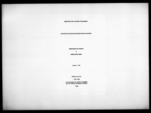 Lettres des évêques d'Ajaccio, Aleria, Nebbio, du comte de Marboeuf, du comte de Saint-Germain, minutes du cardinal de Bernis, copies de lettres patentes de Louis XV en faveur de Corses conjurés, etc. ; correspondance du cardinal de Bernis avec les officiers municipaux de Bastia, au sujet de grains à acheter (1790).