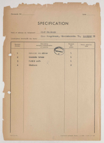 établies par les Allemands, déclarations de propriété des biens enlevés lors de l'occupation allemande, constats de