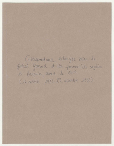 Un peu moins abondante, cette seconde partie du fonds permet d'apporter un éclairage sur d'autres aspects de sa personnalité. Outre ses engagements associatifs (399 PAAP/347-348), le point qui frappe le plus, et qui pourrait à lui seul faire l'objet d'une étude, est son activité d'épistolier infatigable et -au final- d'archiviste. Aidé il est vrai par son secrétaire, Gouraud fait preuve dans le classement de sa volumineuse correspondance personnelle d'un réel goût pour les archives. La plupart des dossiers se présentent dans des sous-chemises ou enveloppes portant un numéro à l'encre rouge ou violette avec, quelquefois, une lettre ou un nom propre de lieu ; plusieurs modes de classement sont choisis : les dossiers nominatifs constitués par le général (399 PAAP/349-441), rassemblant sur une centaine d'articles la correspondance active et passive d'amis et de relations, à laquelle est jointe une documentation les concernant, sont classés dans une série générale d'une part (ordre alphabétique des correspondants, 399 PAAP/349-398, avec des vedettes sur quelques sommités comme Lyautey et sa famille, 399 PAAP/377-380 ou encore Pétain, 399 PAAP/387). Suivent d'autres dossiers de correspondants, tout aussi vastes, constitués eux dans un ordre thématique (399 PAAP/399-441) : hormis les correspondantes féminines (399 PAAP/399-400), les personnes morales, associations et comités (399 PAAP/439-440) ou encore ceux qualifiés d' « aventuriers » (399 PAAP/441), classés à part, l'ensemble des autres correspondants s'insère dans un cadre de classement géographique, chacun étant répertorié selon son pays d'origine ou d'exercice, depuis la Belgique (399 PAAP/402-404) jusqu'à la Syrie (399 PAAP/428-437), en passant par ses terres d'élection que furent les Etats-Unis (399 PAAP/409-415), l'Alsace (399 PAAP/418/420) et bien sûr le Maroc (399 PAAP/421-422).