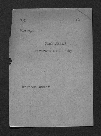 Pour les fiches peintures et dessins (cartons 738 à 760 et 805bis à 809), voir la liste Excel. Les informations relatives aux restitutions ou aux non restitutions doivent pêtre prises avec précaution et confirmées par les décharges de restitutions (série CRA ou série 13BIP).