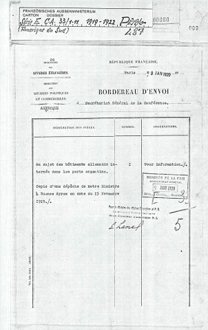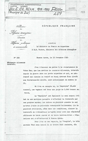 Sort des navires allemands retenus dans les ports argentins (novembre 1919-janvier 1921). Implantation d'entreprises allemandes (février-mars 1921). Sentiments pangermanistes de la colonie allemande de Buenos Aires (avril-juin 1922).