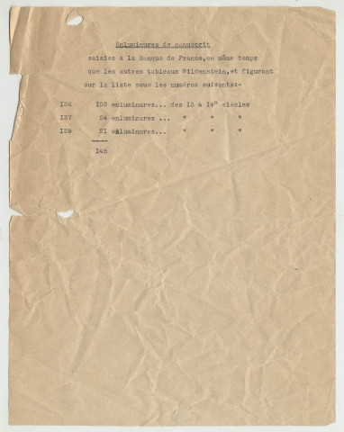 Les fichiers d'œuvres spoliées (série « Fichiers », cotée 209SUP/738-887) ont été établis d'après les déclarations de victimes ou d'après la listes des biens retrouvés en Allemagne et en Autriche.