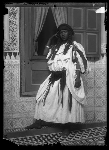 Femme en costume traditionnel dans l'encadrement d'une pièce (même lieu et personne que 57747).