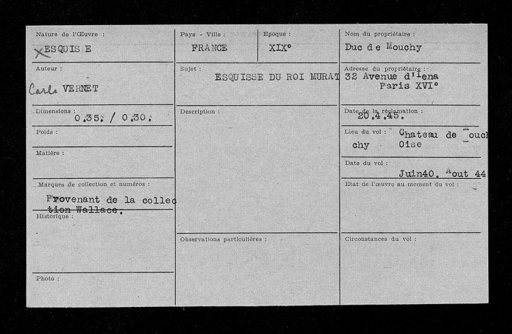 Pour les fiches peintures et dessins (cartons 738 à 760 et 805bis à 809), voir la liste Excel. Les informations relatives aux restitutions ou aux non restitutions doivent pêtre prises avec précaution et confirmées par les décharges de restitutions (série CRA ou série 13BIP).
