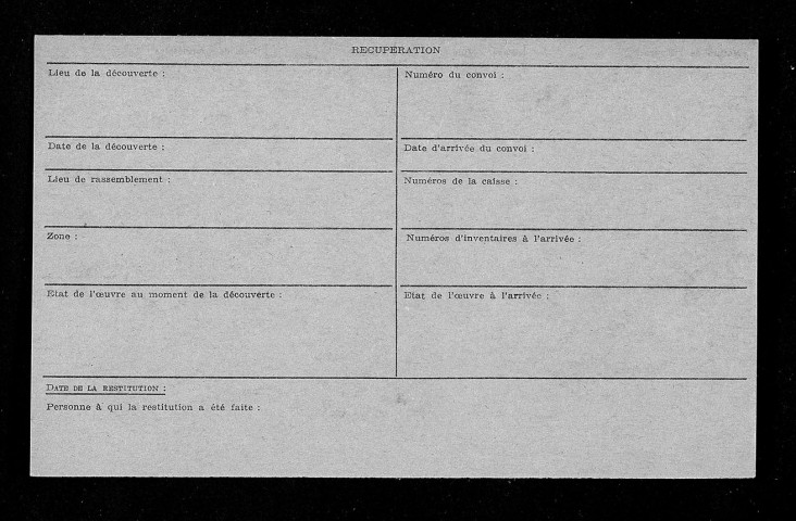 Cette série contient les fichiers - fichiers d'oeuvres spoliées, fichiers d'oeuvres rassemblées dans les collectings points puis rapatriées, fichiers de propriétaires spoliés, fichiers d'achats faits par les Allemands, autres fichiers - établis par les services de récupération artistique (Commission de récupération artistique, Bureau central des restitutions, Bureau d'investigation artistique, Collecting Points). Classement par types d'objets, noms d'artistes, noms de collectionneurs, noms de marchands.