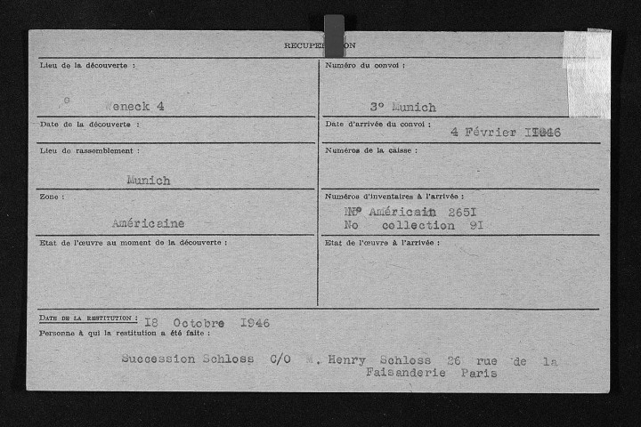 Pour les fiches peintures et dessins (cartons 738 à 760 et 805bis à 809), voir la liste Excel. Les informations relatives aux restitutions ou aux non restitutions doivent pêtre prises avec précaution et confirmées par les décharges de restitutions (série CRA ou série 13BIP).