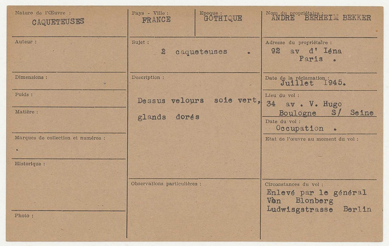 Les fichiers d'œuvres spoliées (série « Fichiers », cotée 209SUP/738-887) ont été établis d'après les déclarations de victimes ou d'après la listes des biens retrouvés en Allemagne et en Autriche.