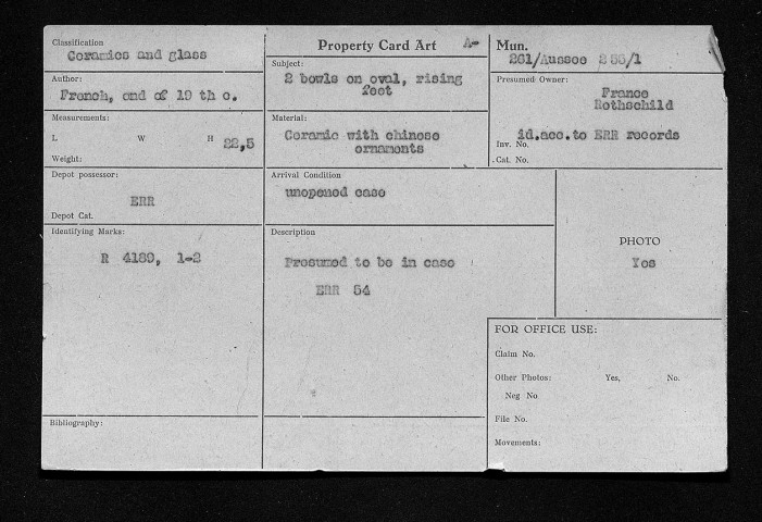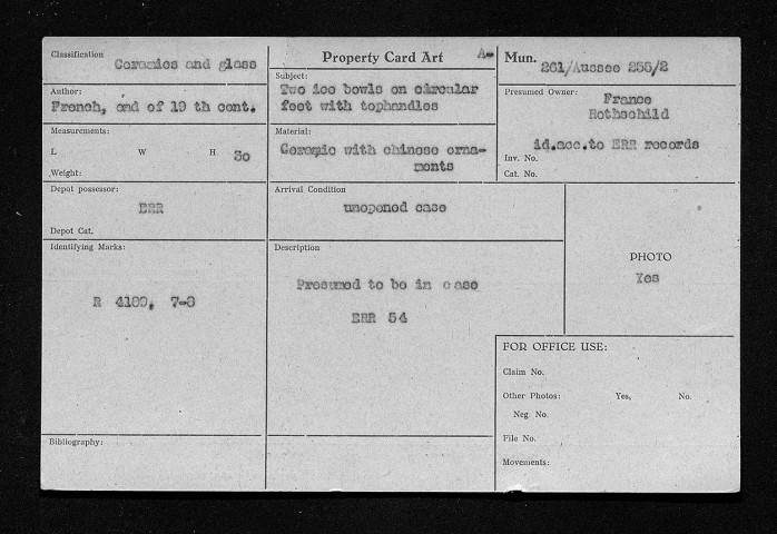 CCP Munich, Property Cards Art. Fichier d'oeuvres rapatriées d'Allemagne. Mobilier, argenterie, tapis.