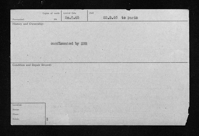 Cette série contient les fichiers - fichiers d'oeuvres spoliées, fichiers d'oeuvres rassemblées dans les collectings points puis rapatriées, fichiers de propriétaires spoliés, fichiers d'achats faits par les Allemands, autres fichiers - établis par les services de récupération artistique (Commission de récupération artistique, Bureau central des restitutions, Bureau d'investigation artistique, Collecting Points). Classement par types d'objets, noms d'artistes, noms de collectionneurs, noms de marchands.