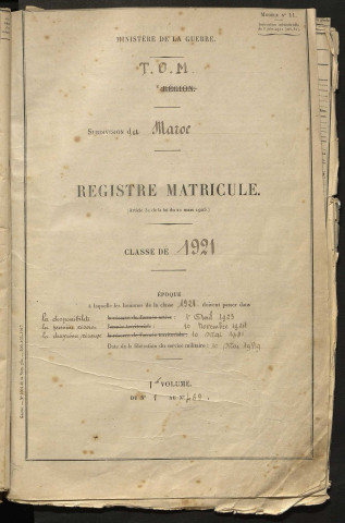 Registres matricules des états signalétiques et des services des appelés de nationalité française. Protectorat Maroc, répertoire numérique dactylographié, CADN, dernière mise à jour août 2011 ; saisie directe au format XML EAD en mars 2015.
