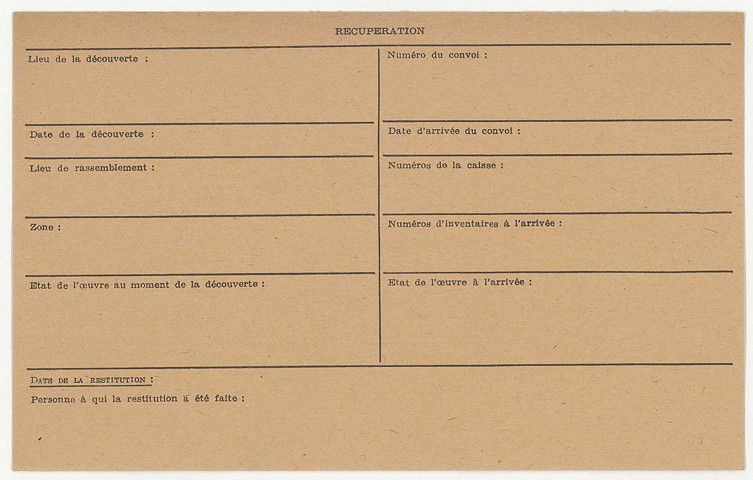 Cette série contient les fichiers - fichiers d'oeuvres spoliées, fichiers d'oeuvres rassemblées dans les collectings points puis rapatriées, fichiers de propriétaires spoliés, fichiers d'achats faits par les Allemands, autres fichiers - établis par les services de récupération artistique (Commission de récupération artistique, Bureau central des restitutions, Bureau d'investigation artistique, Collecting Points). Classement par types d'objets, noms d'artistes, noms de collectionneurs, noms de marchands.