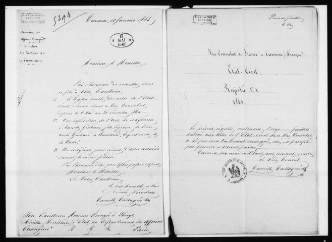 Registres d'état civil consulaire : naissances, mariages, décès. Ces registres consistent souvent en de simples cahiers de quelques feuillets ou des volumes reliés couvrant chacun une année. Cependant, les registres d'état civil de certains postes, en particulier d'Afrique du Nord, ont été reliés avant leur versement aux Archives diplomatiques en volumes regroupant les registres sur plusieurs années. Certains registres ne contiennent aucun acte.